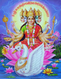 Gayatri is the mother of all the vedas. Gayatri pervades everywhere. Gayatri consists of three deities, Gayatri, Savitri, and Saraswati. Of these, the first one is master of the sense, the second is the teacher of truth, and the third is the master of speech. Hence it is a Trinity of the senses, the mind, and speech. She is the Param Sakti (i.e., the sustaining Force that animates all life), the universal mother and the power of god manifestation. She is depicted as sitting on a lotus with the five faces (hence called the Punchamukhi) representing the panca pranas (five basic energy or life forms) and the panca tatwas (five elements) and the ten hands holding the various ayudas (weapons).